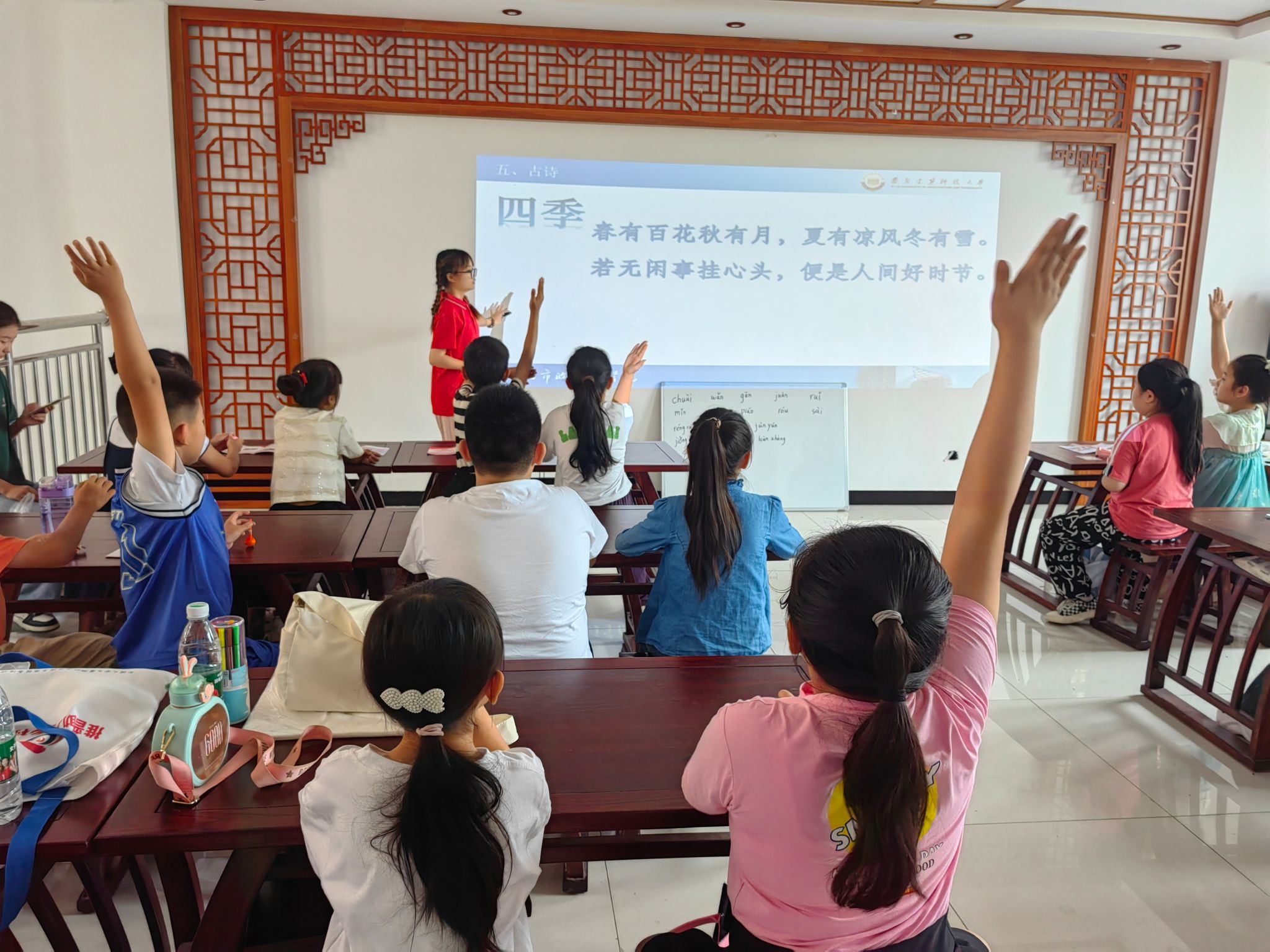 图为团队成员在商州区南秦社区用普通话为社区儿童教学。任治锦 摄