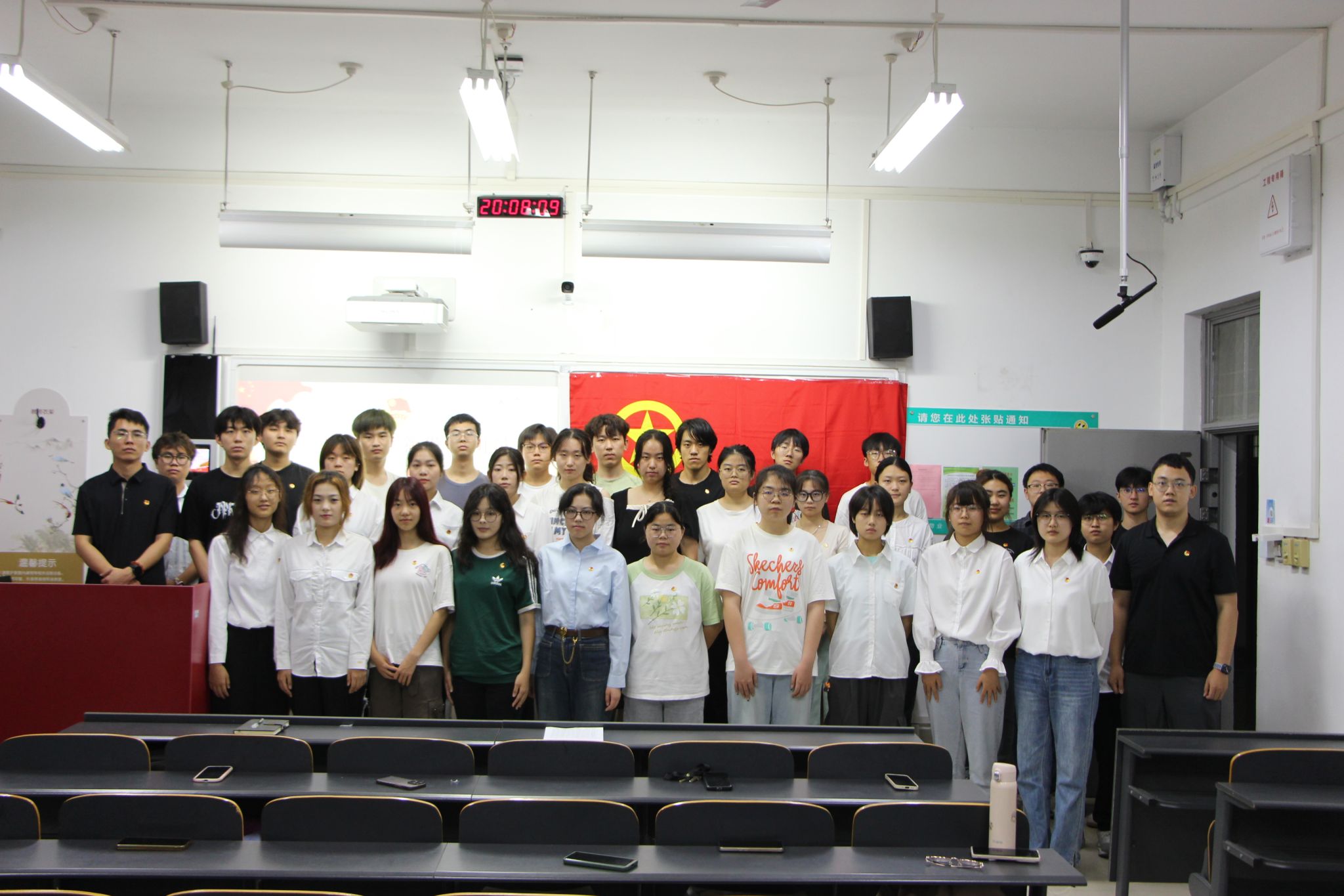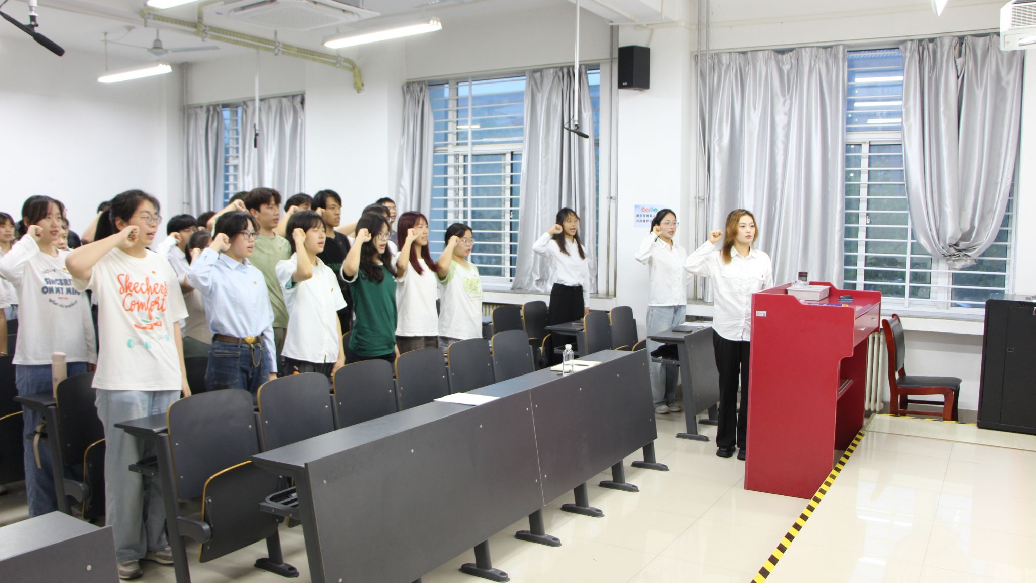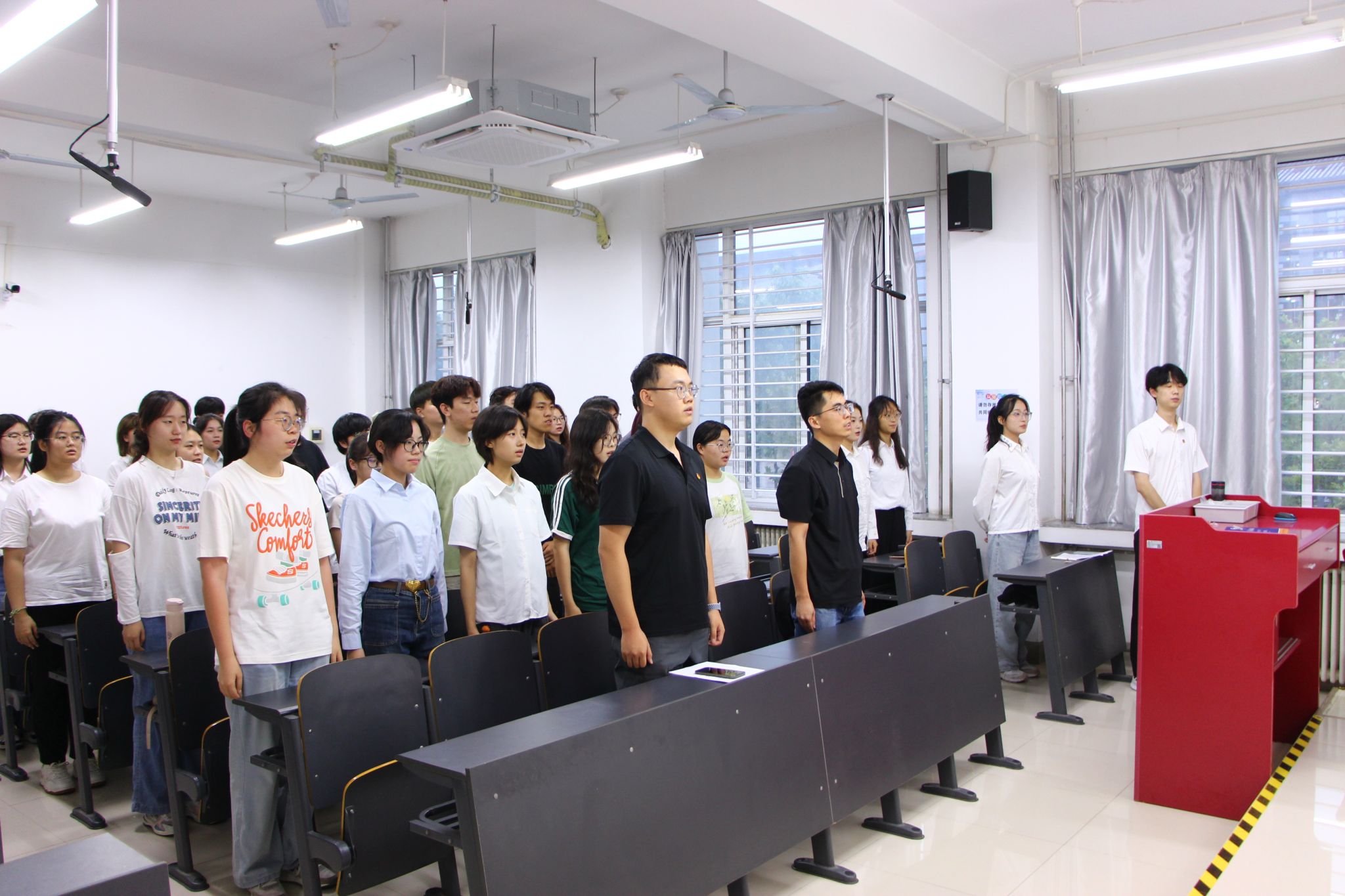 仪式伊始,全体师生起立,奏唱国歌,昂扬的旋律激励着新团员们以更加饱满的热情投身于祖国的建设之中。