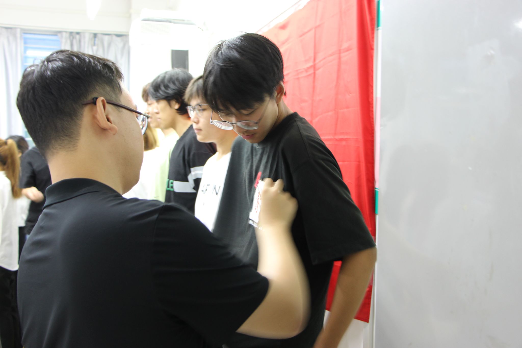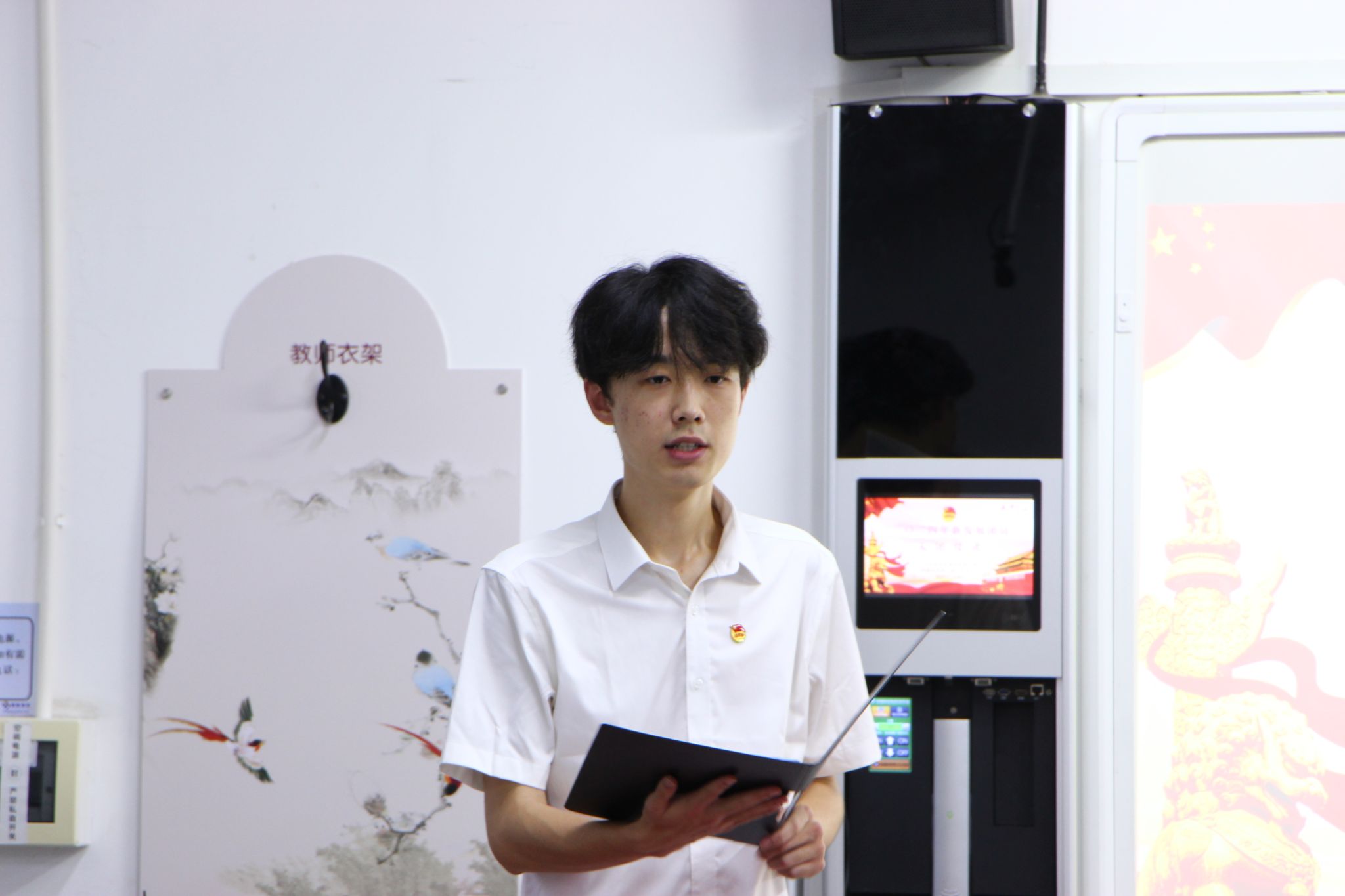 接着,由杨依谋老师宣读新发展团员名单,两位老师为新发展团员佩戴团徽,并对同学们表示祝贺。
